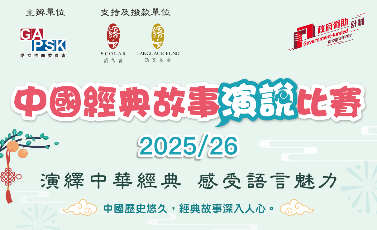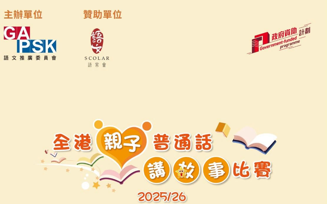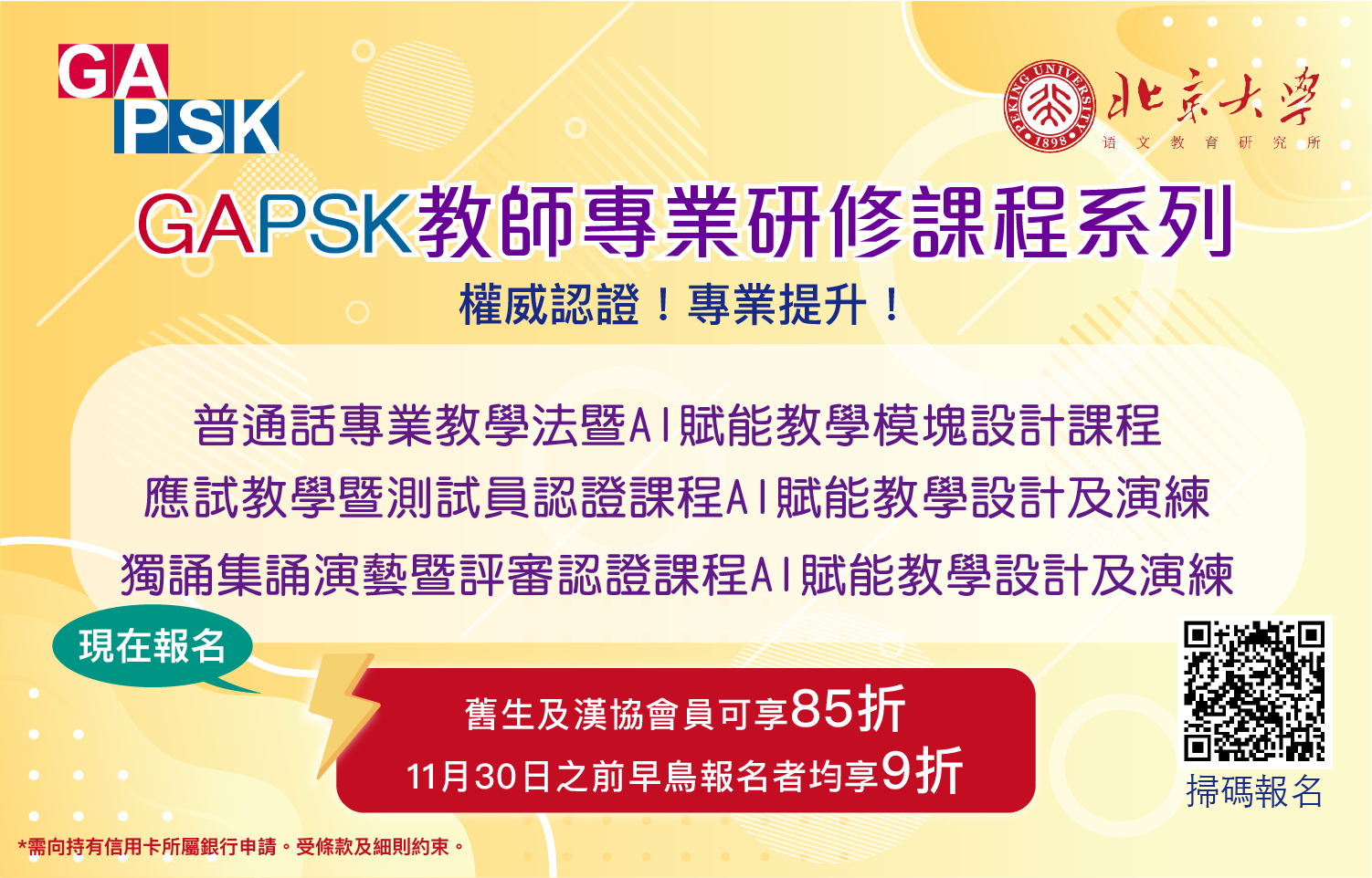 GAPSK 首頁 現正接受報名 現正接受報名 現正接受報名 第61屆GAPSK全港普通話朗誦比賽 比賽日期:2026年1月18日 (日)截止日期:2026年1月2日(五)地點:東華三院黃笏南中學 (九龍仔牛津道1C號) 最新資訊/活動 網上訂書服務 普通話AI自學平台 教師專業培訓 HSK漢語水平考試 語文推廣活動 香港學生首次代表香港參加全國總決賽 展現卓越成績 為港爭光 全港親子普通話講故事比賽 中國經典故事演說比賽 中華經典誦讀港澳展演交流活動 全港傑出普通話教師嘉許禮 其他國際漢語考試 其他資訊/優惠