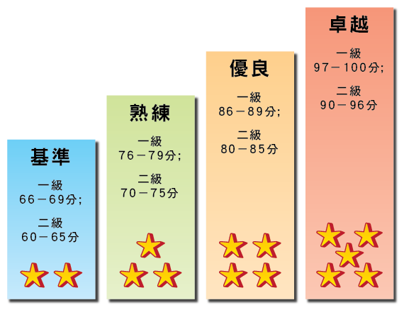 將GAPSK幼稚園普通話水平考試的每個等級細分為兩級,分別為卓越一、二級,優良一、二級,熟練一、二級及基準級一、二級。其他內容保持不變,分數細分內容請見下圖: