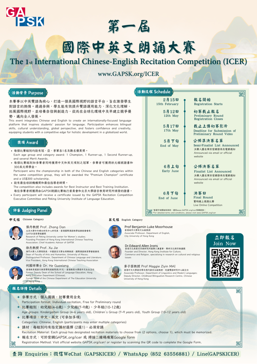 - 聯繫人:GAPSK朗誦比賽執行委員會